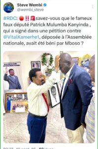 Selon la source, ce faux député au nom de Patrick Mulumba Kanyinda qui a signé la petition contre Kamerhe serait dans le cabinet de Samuel Mbemba, le Ministre des droits humains, très proche de Christophe Mboso, 2ème vice-président de l’Assemblée nationale ;